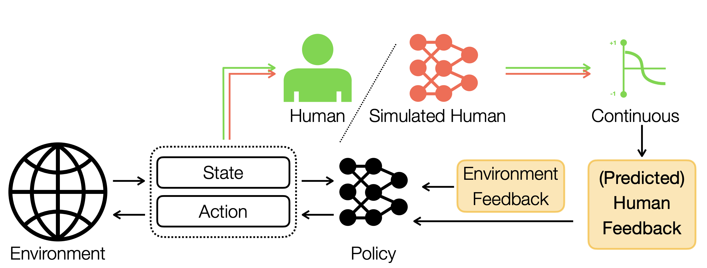 The recent rapid advancement of machine learning has been driven by increasingly powerful models with the growing availability of training data and computational resources. However, real-time decision-making tasks with limited time and sparse learning signals remain challenging. One way of improving the learning speed and performance of these agents is to leverage human guidance. In this work, we introduce GUIDE, a framework for real-time human-guided reinforcement learning by enabling continuous human feedback and grounding such feedback into dense rewards to accelerate policy learning. Additionally, our method features a simulated feedback module that learns and replicates human feedback patterns in an online fashion, effectively reducing the need for human input while allowing continual training. We demonstrate the performance of our framework on challenging tasks with sparse rewards and visual observations. Our human study involving 50 subjects offers strong quantitative and qualitative evidence of the effectiveness of our approach. With only 10 minutes of human feedback, our algorithm achieves up to 30% increase in success rate compared to its RL baseline.