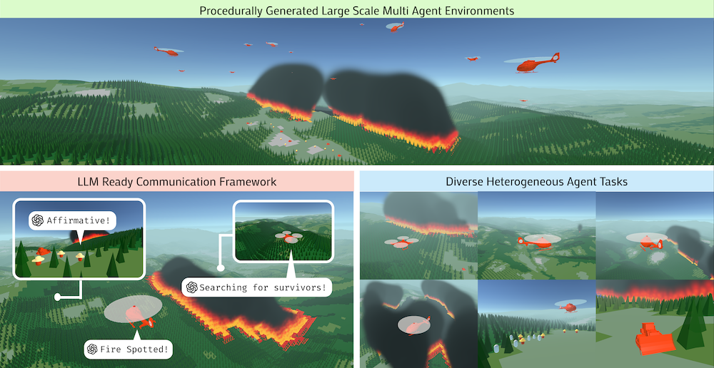 offers procedurally generated wildfire response scenarios featuring large maps, heterogeneous agents, partial observability, stochastic dynamics, and long-horizon planning objectives. The environment supports both low-level control and high-level natural language interactions through modular perception